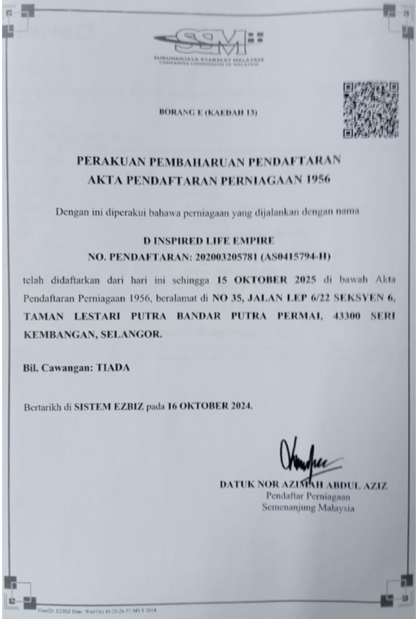 Untuk makluman anda, saya adalah ahli D'INSPIRED LIFE yang SAH. Username saya ialah mejarpalil. Jika anda ada sebarang pertanyaan, sila hubungi saya: