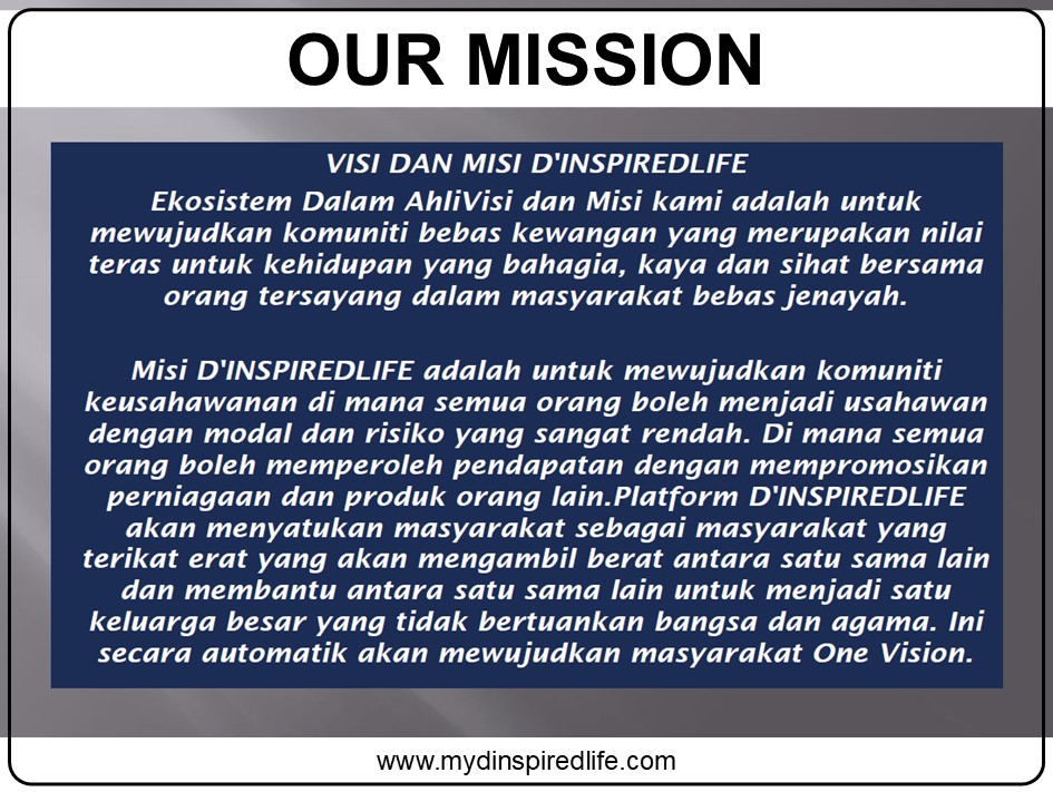 D'INSPIRED LIFE merupakan satu Platform yang membolehkan ahlinya mencipta pendapatan yang luar biasa melalui kaedah perkongsian penggunaan sistem pengiklanan di D'INSPIRED LIFE kepada orang lain yang berkonsepkan saling bantu membantu dalam komuniti.