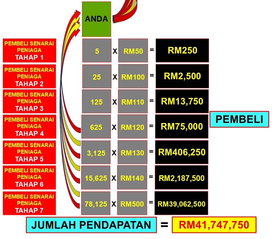 LANGKAH 10 - Bila pembeli di Tahap 3,4,5,6 dan 7 anda upgrade atau Membeli Senarai Peniaga, anda boleh menjana keseluruhan income sebanyak RM41,747,750.